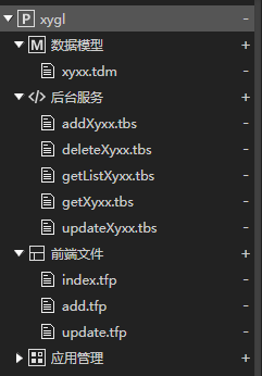 通过前面的操作,我们已经创建好了一个简单的学员信息增删改查模块,现在在 TaskBuilder 的系统资源管理器内,我们展开 xygl 这个项目的所有子节点,会看到下图所示的资源结构: