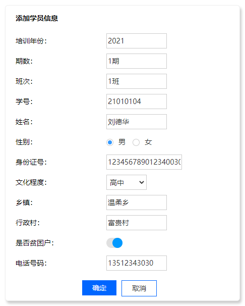 录入学员信息后,点击确定按钮,完成学员信息的添加,系统会自动跳转到列表页,就可以看到刚才添加的学员信息,如下图所示: