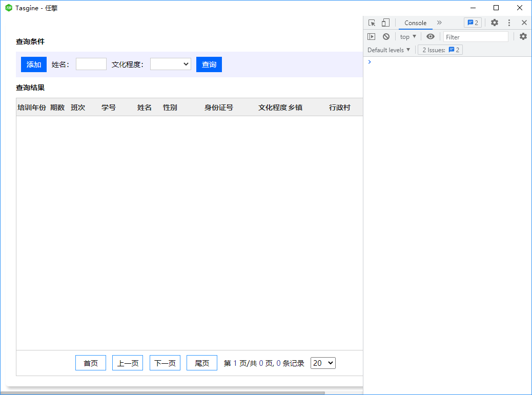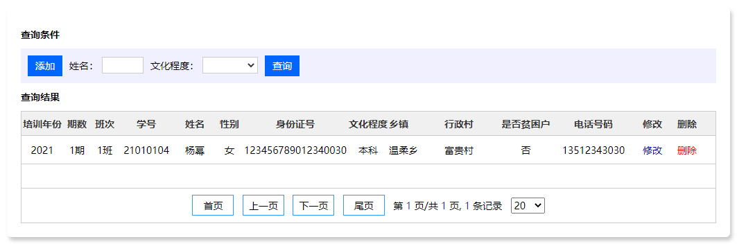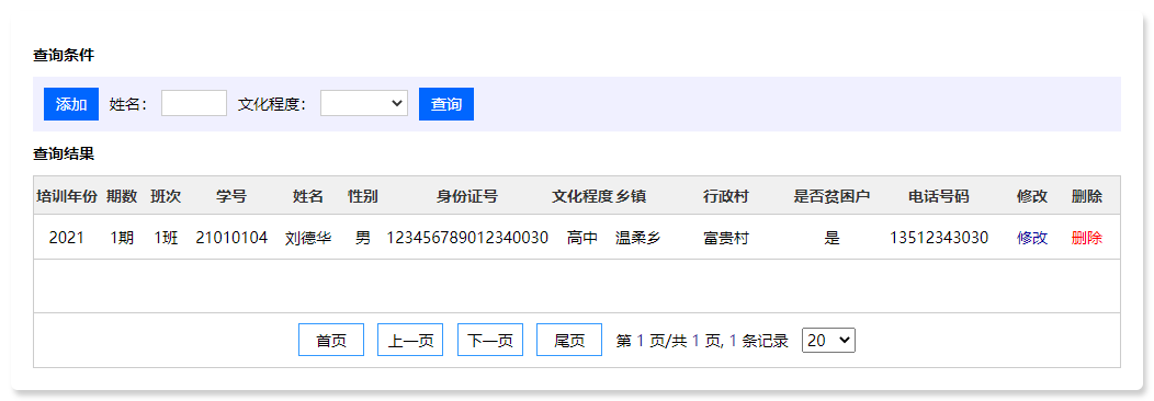 如果学员信息比较多,可以使用列表页面顶部的查询条件,可以按姓名、文化程度查询。
