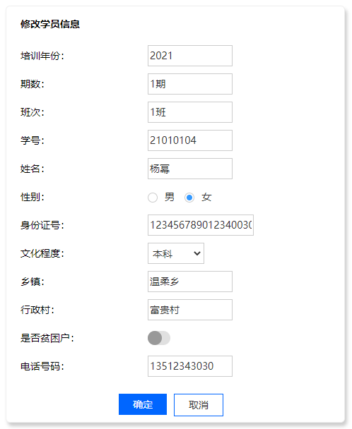 我们修改一下姓名、性别、是否是贫困户这三项信息,然后点击确定按钮,修改成功后回到列表页就可以看到修改后的信息已生效,如下图所示: