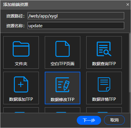 在“资源名称”输入框内输入:update,然后在下面的资源类型列表里点击 “数据修改TFP” 按钮,然后点击 “下一步” 按钮,打开如下图所示的 “创建数据修改TFP” 向导对话框: