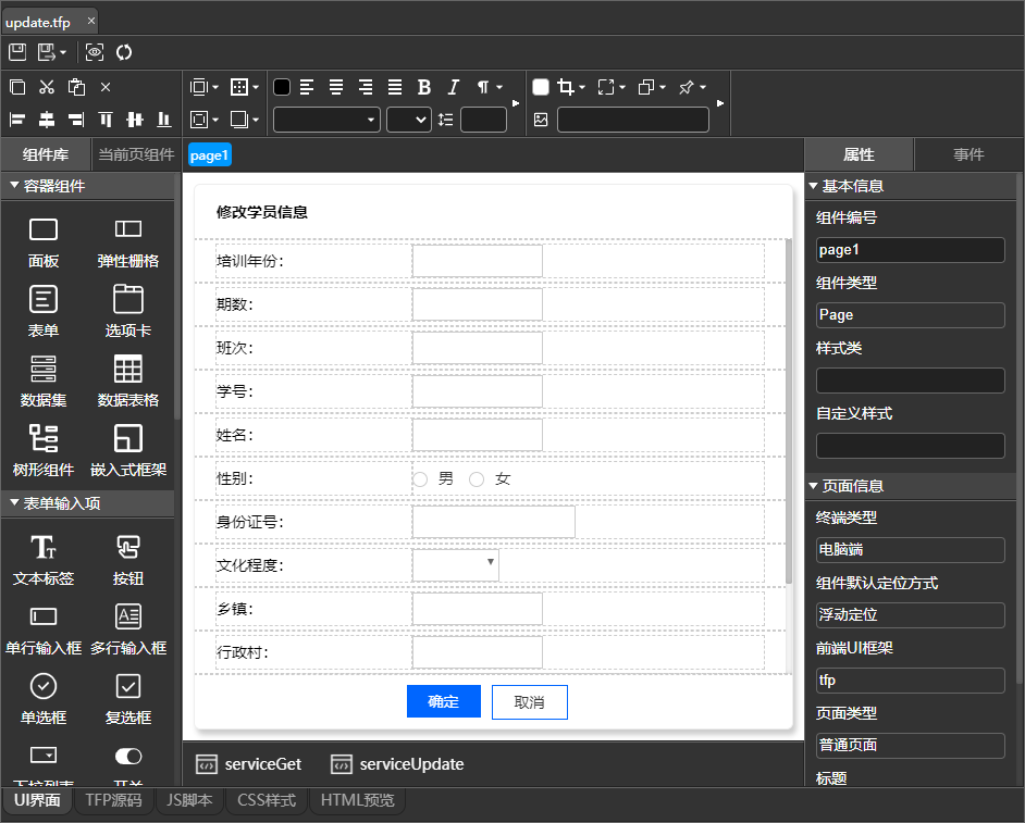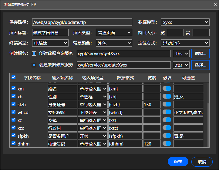然后点击字段列表里标题栏最左侧的复选框,全选所有字段,并参考上图,修改性别、文化程度和是否贫困户这三个字段的输入项类型,设置可选值,修改身份证号和电话号码这两个字段的宽度,其他字段不用做任何修改,默认即可,然后点击 “确定” 按钮,即可完成学员信息修改页面的创建,TaskBuilder 会根据我们前面选择的字段及相关设置,自动创建对应的tfp页面以及输入项,如下图所示: